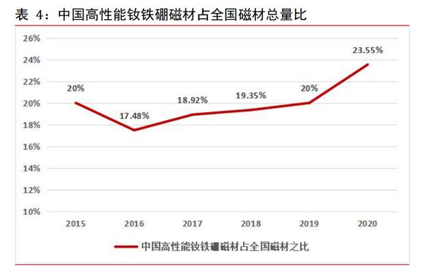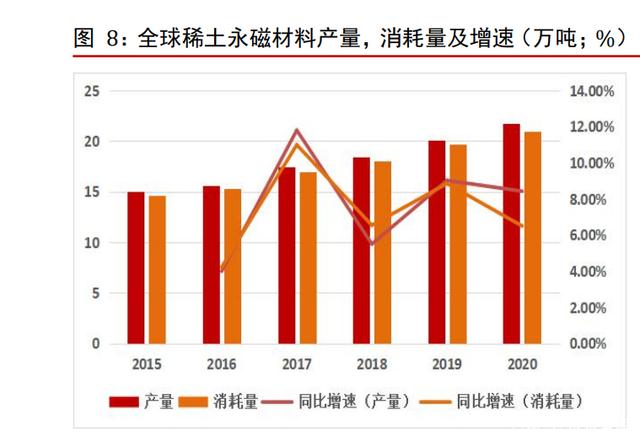 2022 年2 月份,宁波韵升公告募投 10.8 亿元用于包头韵升年产 1.5 万吨高性能稀土磁材项目。2020 年中国高性能钕铁硼磁性材料共计产能接近 9 万吨,而全年产量仅有4.62万吨。根据各稀土永磁上市公司统计,到 2025 年中国高性能钕铁硼磁材产能合计约为20万吨,未来产能利用率有望进一步提升,不断加大高性能磁材供给。(报告来源:未来智库)