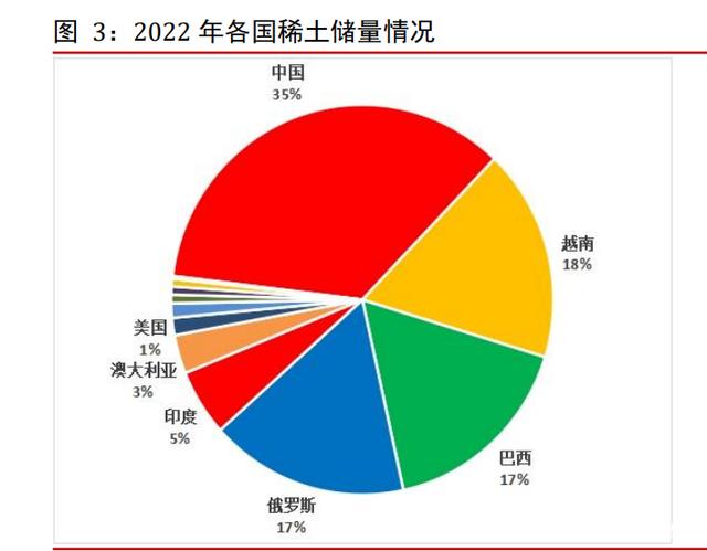 稀土作为一种不可再生资源,且为我国战略性核心资源,在于稀土能大幅度地提高其他产品的质量和性能。根据美国地质调查局的数据显示,2022 年全球稀土储量约为1.25亿吨,其中中国储量为 4400 万吨,约占全球 35%。此外越南、俄罗斯、巴西稀土储量靠前,分别为 2200 万吨、2100 万吨及 2100 万吨,以上四国占据全球稀土储量87%。产量方面,2021 年中国稀土矿产量达到 168000 吨,位居世界第一。其他稀土矿产量较多的国家为美国、缅甸、澳大利亚,产量分别达到 43000 吨、26000 吨及22000吨。