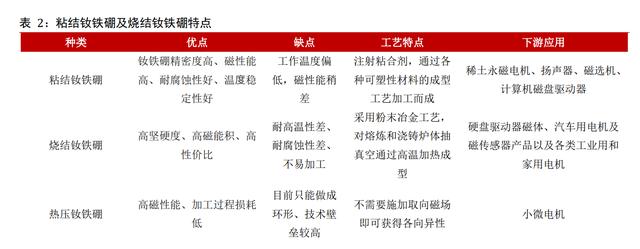 粘结钕铁硼、烧结钕铁硼、热压钕铁硼。当代钕铁硼磁材主要分为粘结钕铁硼及烧结钕铁硼两种,两者区别主要在于工艺上的不同。粘结钕铁硼是在钕铁硼磁粉中注射粘合剂,再通过各种可塑性材料的成型工艺加工而成,目前主要运用于硬盘驱动器磁体、汽车电机及磁传感器以及其他各类工业用和家用电机。